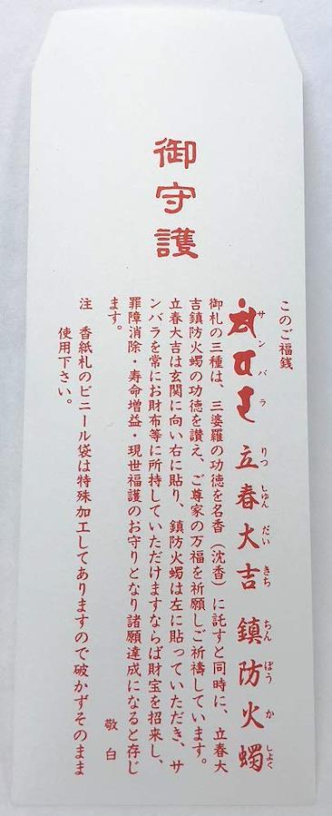 このお札は立春大吉札と言い、厄除け開運の御札です。 火災消滅の鎮防火燭の御札と一対に玄関に貼ります。 立春の日に立春大吉札を門に向い右に、鎮防火燭を左に貼ります(シールになっています)。同封されている福銭サンバラは沈香の香りのする厄除け開運のお守りです。 一年経ちましたお札は身近な寺社か当山にお納めください。 お送りになられる方は送料をご負担の上、郵送してください。紙製 サイズ 縦12cm×横4cm このお札は立春大吉札と言い、厄除け開運の御札です。 立春の日に立春大吉札を門に向い右に、鎮防火燭を左に貼ります。 同封されている福銭サンバラは沈香の香りのする厄除け開運のお守りです。 一年経ちましたお札は身近な寺社か当山にお納めください。 お送りになられる方は送料をご負担の上、郵送してください。 紙製 サイズ 縦12cm×横4cm