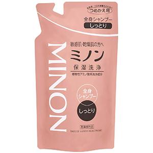 ■商品概要メーカー:第一三共ヘルスケア商品名:ミノン 全身シャンプーしっとりタイプ 詰替用(380mL)区分:医薬部外品内容量:380mL商品概要:アレルギーの原因物質を極力カットした無色素・微香性の全身洗浄料です。健康な素肌と同じ弱酸性。低刺激性。素肌に余分な負担をかけにくい植物性アミノ酸系洗浄成分を配合。うるおいを守りながら汚れを洗い流すので、洗いあがりはつっぱらず、しっとりつるつるです。JANコード:4987107615930商品コード:050811322■