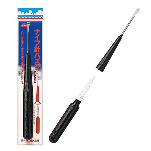 竿受、竿掛、オモリ等のフィッシング用品を製造する第一精工のナイフ針ハズシ。柄の部分にナイフを内蔵しているので、針をはずしたすぐ後で、魚をシメられる。ステンレス製ウェーブナイフ内蔵。