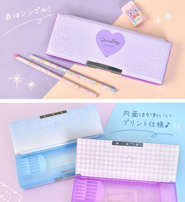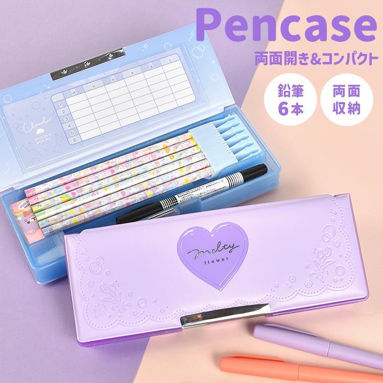 【ルックインソフトペンケース】スリムサイズなのに収納力抜群な両面開きの筆箱が新登場。鉛筆6本と消しゴム、名前ペン、各種定規がぴったり入ります!外側はシンプル、内側はかわいい柄プリント♪低学年から高学年まで、飽きずに使えるおしゃれなデザインです。