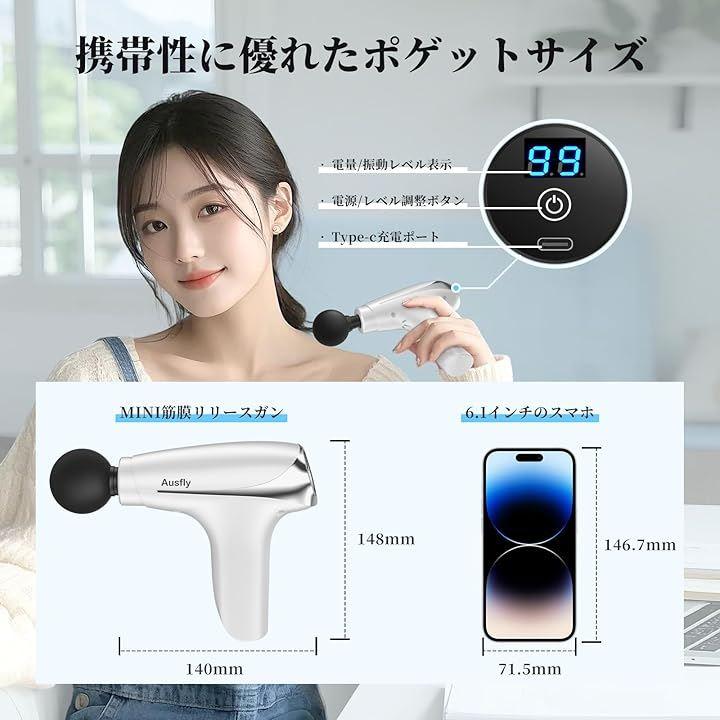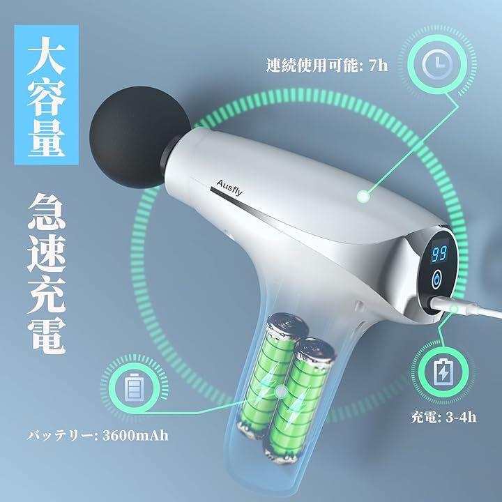 「大容量バッテリー&小型軽量」Ausflyミニ筋膜ガンは、1800mAhの大容量バッテリーを2個内蔵しており、フル充電で最長約7時間の連続使用が可能です。