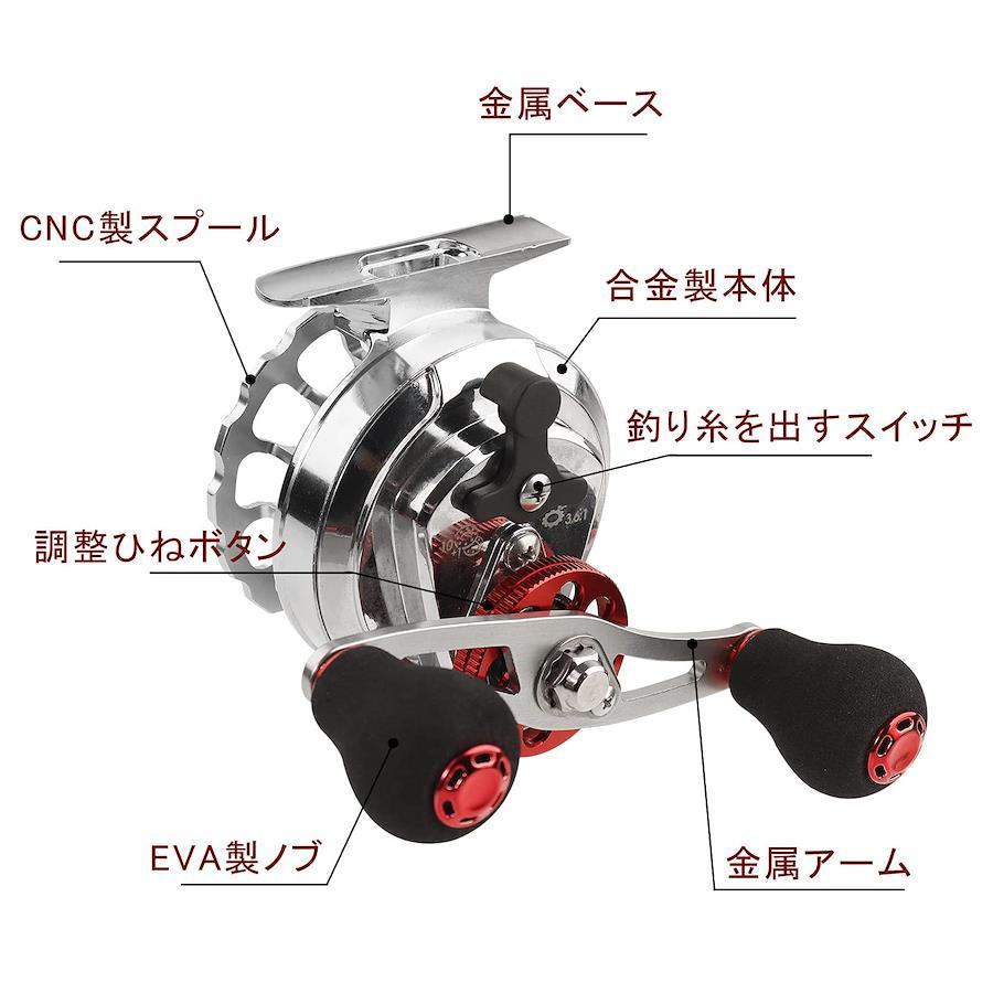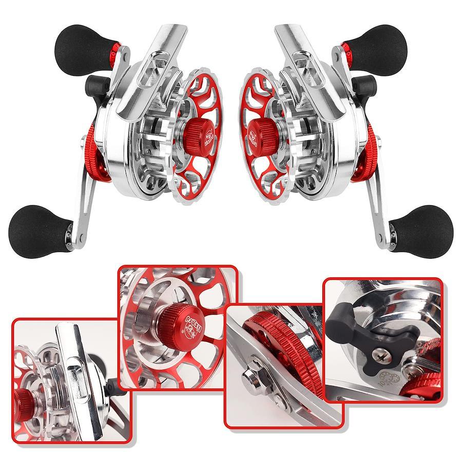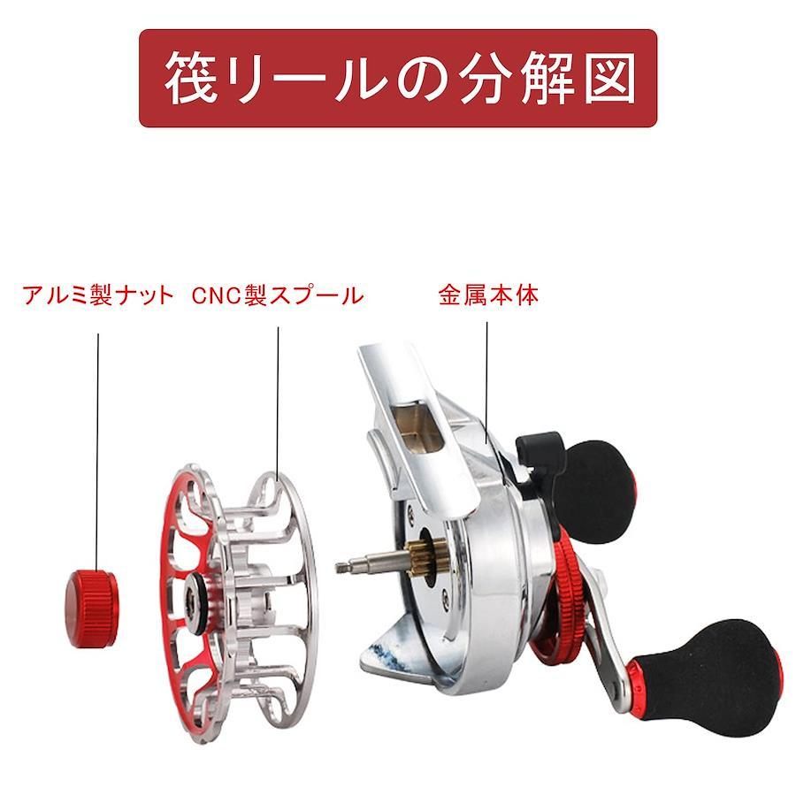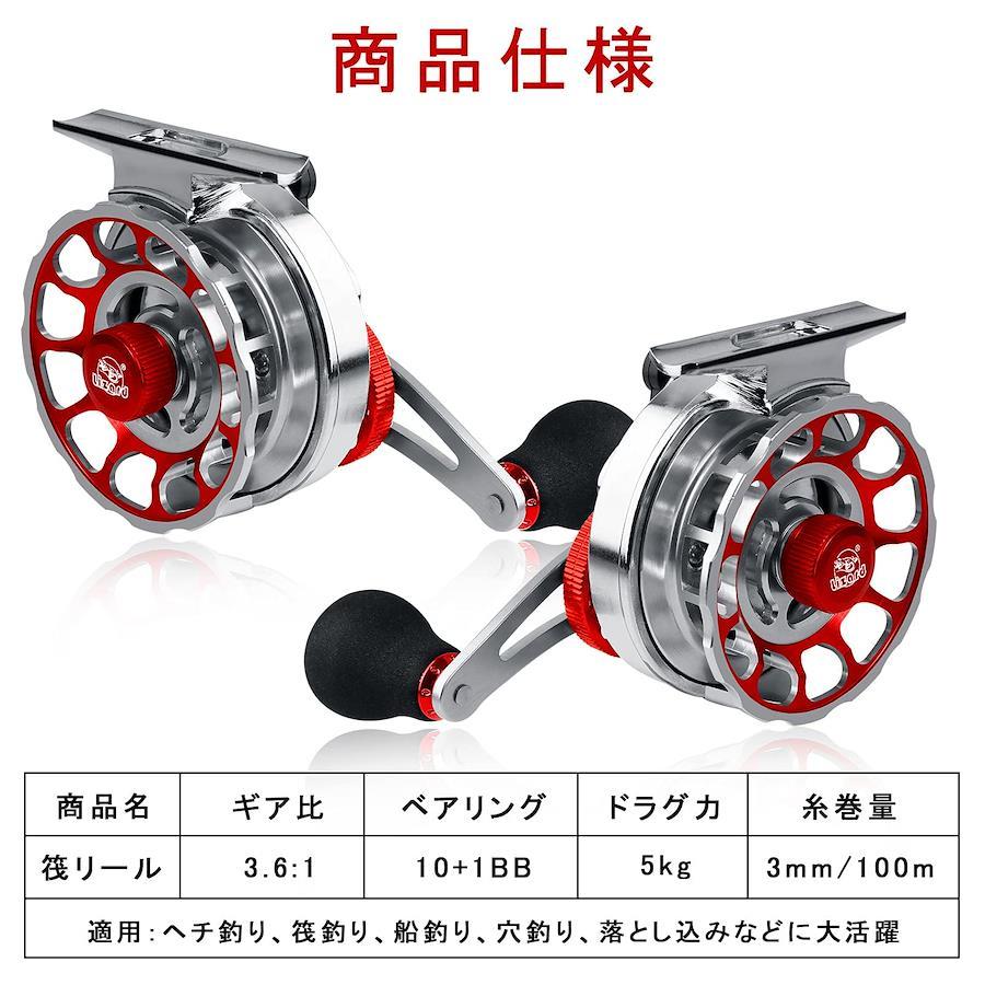 【商品仕様】自重:0.3 kg 10+1BB ギア比:3.6:1 標準糸巻量:3号/100m ドラグ力:5kgまで。利き手:右ハンドルは左手で竿を持って右手でリールを巻きます。ご購入前にご確認ください。【超軽量設計】筏リールは60mmの大口径スプールによる巻きの速さ、糸巻量:3mm/100m。筏リールはCNC機械加工で強度が高く、スプールにはフェイク・エングレービングが施され、長時間の使用でもスプールが壊れることはない。【クラッチ機能付き】筏リールはクラッチ機能が付いており、クラッチボタンを押すことでラインを自由に調整することができます。また、調整可能なツイストボタンでラインの放出スピードを調整することで、過度のライン放出を防ぎ、釣り糸を保護することができます。【高品質素材】チヌリールの本体はすべて金属製で、強度が高く軽量です。金属酸化処理されたドライブギアとCNC加工されたスプールを備えています。腐食や錆に強く、耐久性に優れています。【幅広く応用】筏リールは広く応用され、筏巻き、氷釣り、カード釣り、船釣り、磯釣り、前釣りなどに適しています。万が一初期不良がございましたらお気軽にご連絡ください。