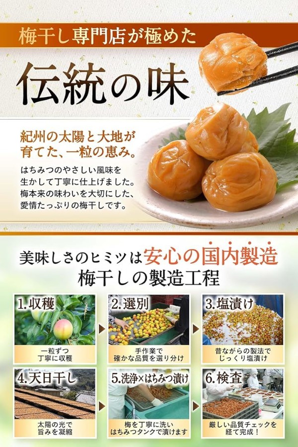 「国内工場で丁寧に製造」和歌山県産紀州南高梅を一粒ずつ丁寧に漬け込み、国内工場で心をこめて手作業でパック詰め・梱包しています。