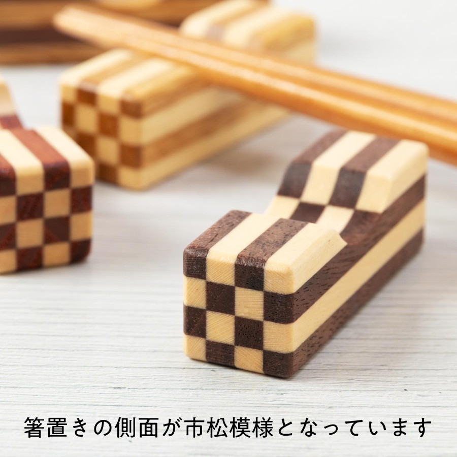 箸を置く、その所作まで整える。箱根の伝統「寄木細工」で仕立てた、市松模様の箸置き。無垢寄木ブロックを削り出し、日常使いしやすい仕上がりに。5cmの扱いやすいサイズで、普段の食卓から来客時まで。7色から選べる楽しさと、並べたときの美しさも魅力です。