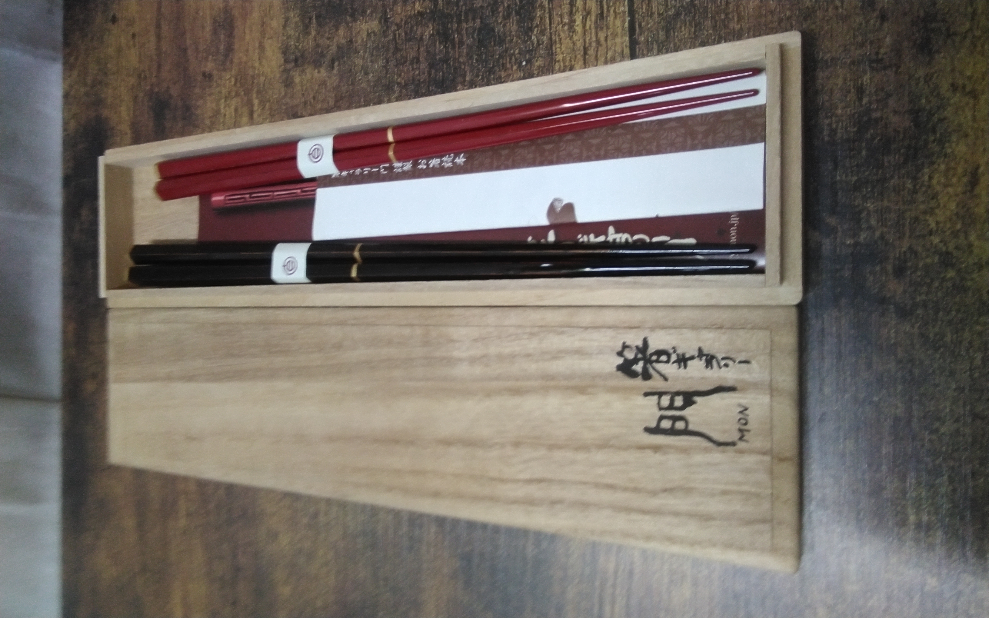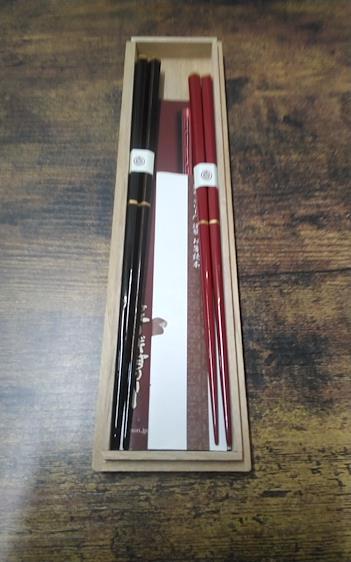 中古品です。ケースに汚れ、色あせがあります。箸はキレイです。箸ギャラリー門の箸、「夫婦箸」です。