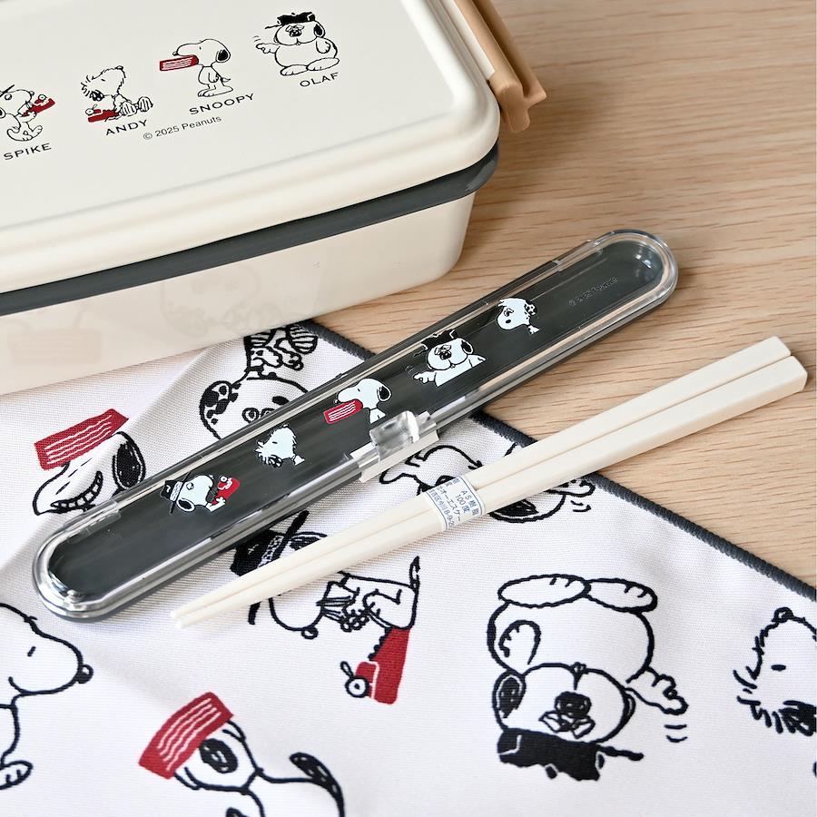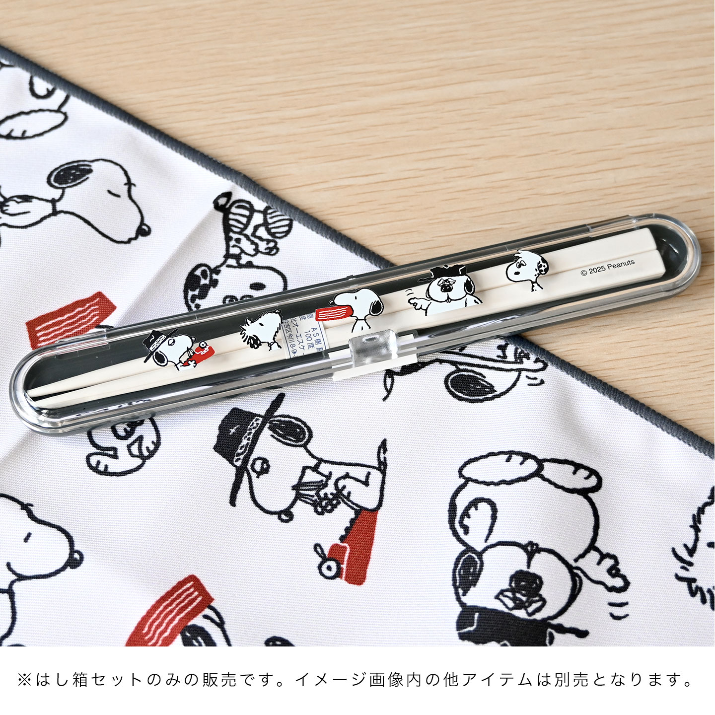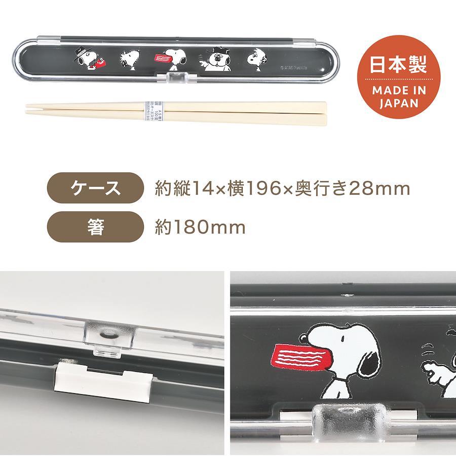 【はし箱セット】年齢・性別問わず使いやすい!スヌーピーと仲間たちの柄が可愛いお箸とケースのセット。開閉しやすいプッシュボタン式のケースで持ち運びも安心!同じ柄のランチグッズで揃えて使うのもおすすめ♪安心の日本製アイテムです。