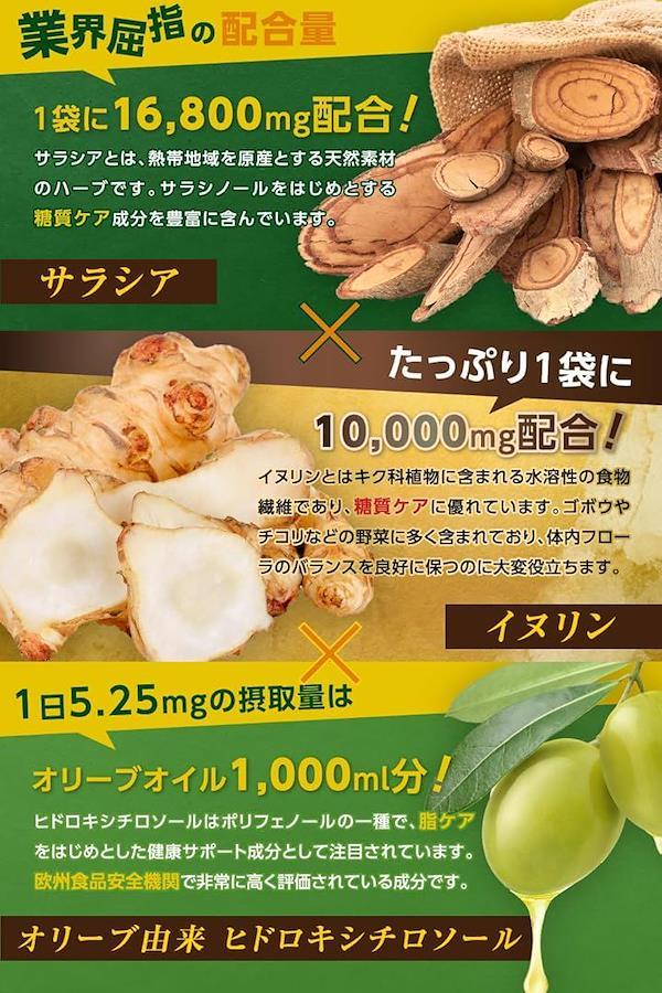 どうぞご安心ください。 1袋あたりサラシア16,800mg、イヌリン10,000mg、オリーブ葉780mgのトリプル成分を配合し、糖とバリアをWケアできる商品を開発致しました。オリーブ由来のヒドロキシチロソールもしっかり1日5.25mg配合し、健康をサポートします。