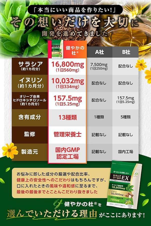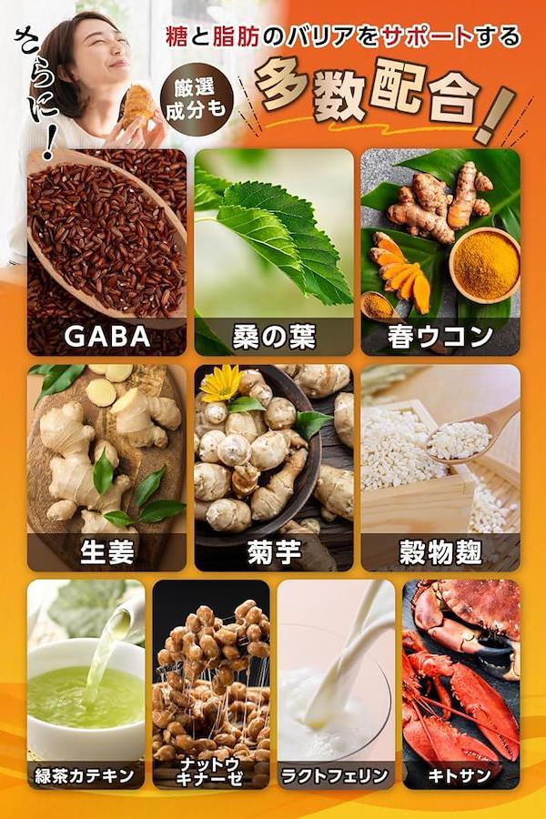 原材料:サラシアエキス末(サラシアエキス、マルトデキストリン)(インド製造)、イヌリン、還元麦芽糖水飴、オリーブ葉抽出物、ギャバ、ハルウコン末、桑葉粉末、菊芋粉末、 ショウガ麹、納豆菌培養エキス末、穀物麹/セルロース、ステアリン酸カルシウム、微粒二酸化ケイ素、ラクトフェリン、キトサン、緑茶抽出物、(一部にカニ・乳成分・大豆を含む)