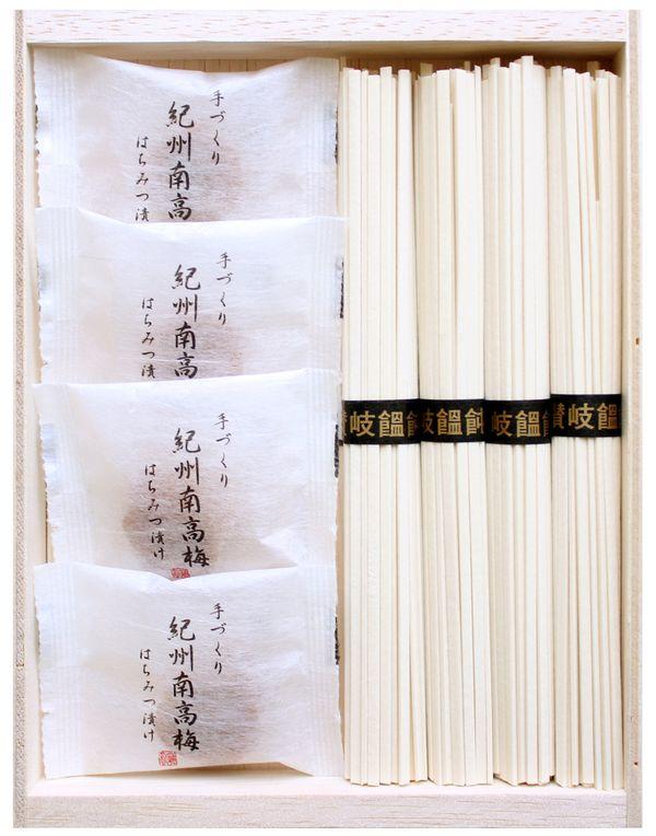 日本一の梅の里、和歌山で収穫された肉厚で皮がやわらかい紀州南高梅。梅の中では最高級品とされているこの梅を、はちみつとリンゴ酢を加え食べやすいまろやかな独自の味に仕上げました。「うどん」といえば讃岐、讃岐といえば「うどん」といわれる程、全国的に名高くなっている讃岐うどん。職人の技から生まれるのどごしとコシが自慢です。