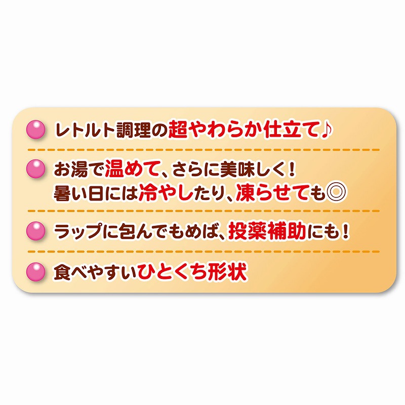 食物センイやビタミンC・Eなど栄養たっぷりのさつまいもをレトルト調理で超やわらかに仕上げました。パピーからシニア犬まで安心の食感とできたてホクホクのふかし芋のような美味しさ!温めてさらに美味しく、暑い日には冷やしたり凍らせても◎。食べやすいひとくち形状。着色料・香料無添加。アルミパウチ6つ入り。