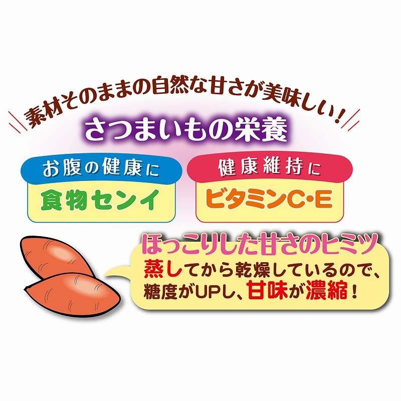 ・素材そのまま。自然の甘みが美味しいサツマイモのおやつです。・蒸してから乾燥しているので、糖度がUPし甘味が濃縮されています。・お腹の健康にいい「食物センイ」や健康維持に必要な「ビタミンC・E」を豊富に含んでいます。・お口の小さなワンちゃんにも食べやすいひとくちタイプ・着色料・香料は使用しておりません。