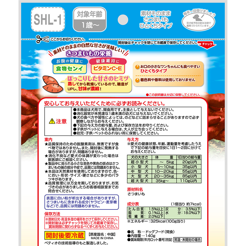 【原材料】さつまいも【保証成分】たん白質1.5%以上、脂質0.1%以上、粗繊維2.0%以下、灰分3.5%以下、水分18.0%以下【エネルギー】325kcal/100g