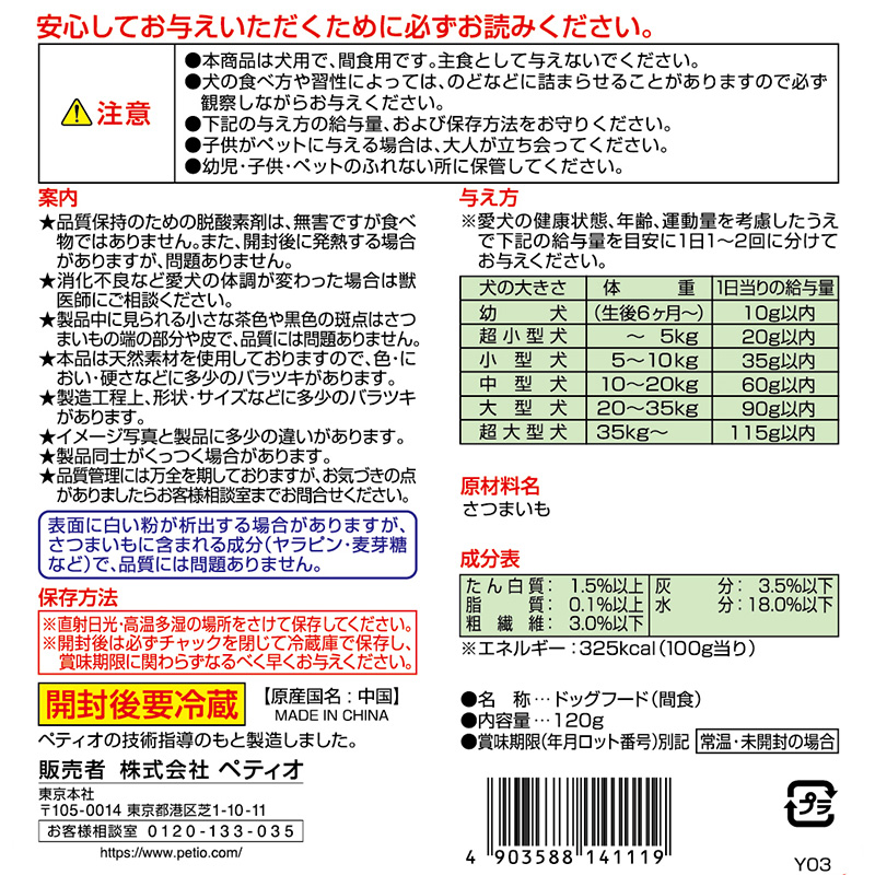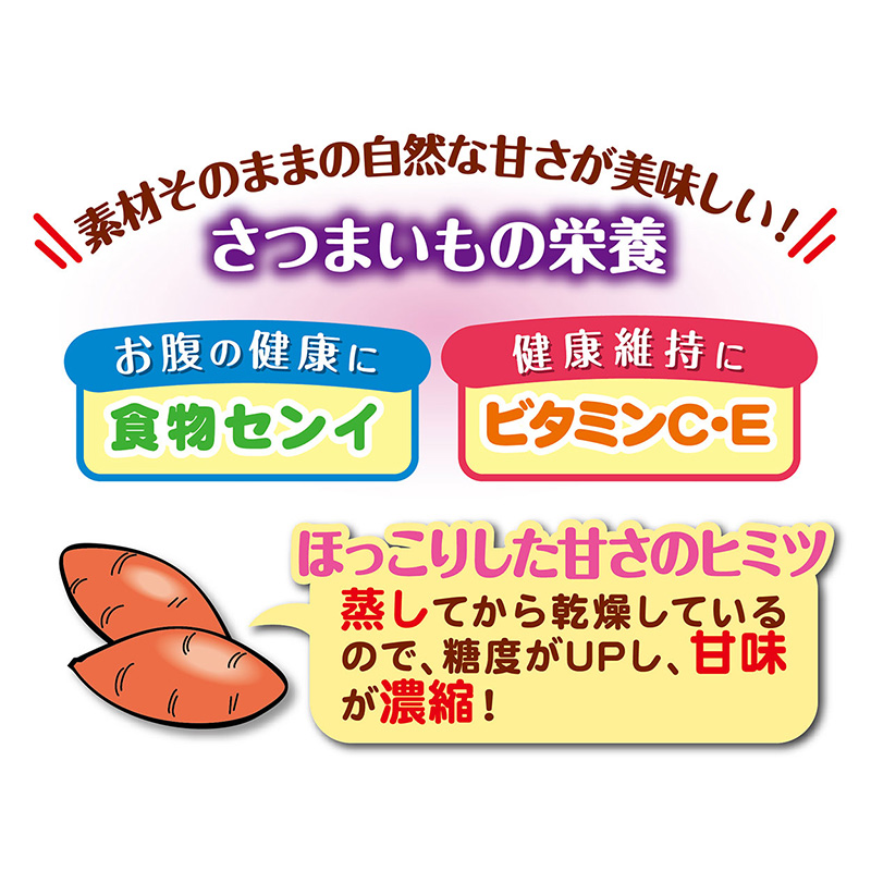 【原材料】さつまいも【保証成分】たん白質1.5%以上、脂質0.1%以上、粗繊維3.0%以下、灰分3.5%以下、水分18.0%以下【エネルギー】325kcal/100g