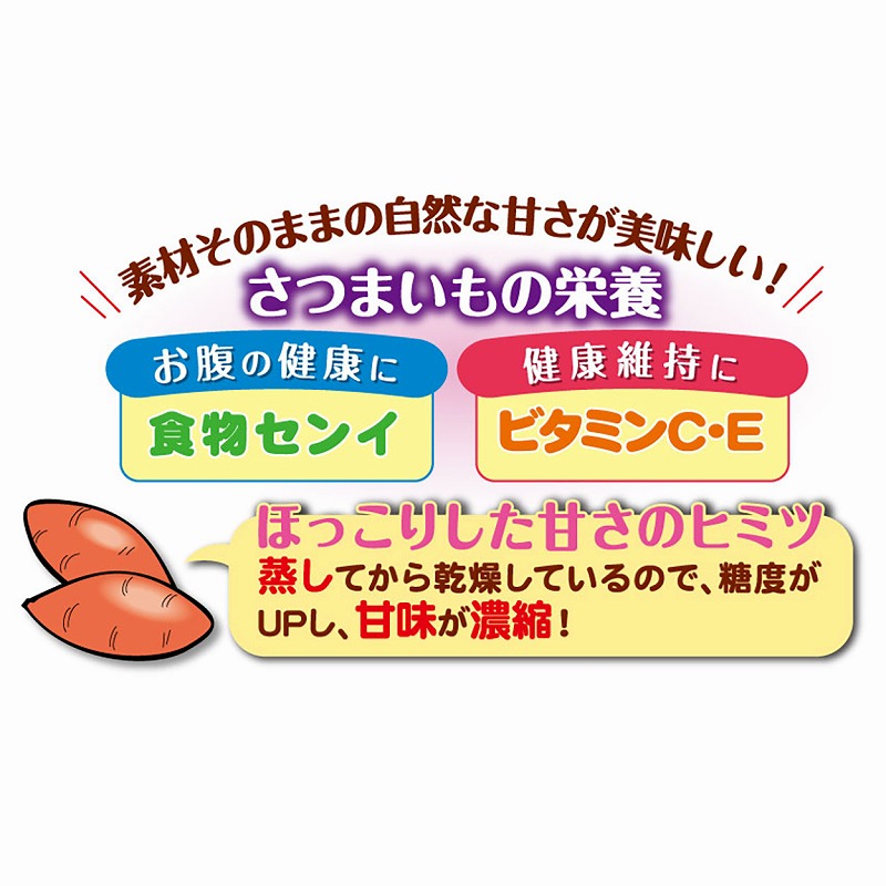 ・素材そのまま。自然の甘みが美味しいサツマイモのおやつです。・蒸してから乾燥しているので、糖度がUPし甘味が濃縮されています。・お腹の健康にいい「食物センイ」や健康維持に必要な「ビタミンC・E」を豊富に含んでいます。・シニア犬にうれしいやわらか仕上げ・硬いものが苦手なワンちゃんにも食べやすいやわらか仕上げ・そのまま食べて食べごたえ満足!好みのサイズにも切って与えやすい・着色料・香料は使用しておりません。