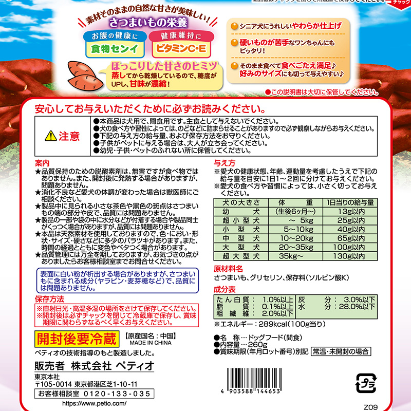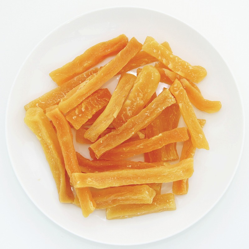 ・素材そのまま。自然の甘みが美味しいサツマイモのおやつです。・蒸してから乾燥しているので、糖度がUPし甘味が濃縮されています。・お腹の健康にいい「食物センイ」や健康維持に必要な「ビタミンC・E」を豊富に含んでいます。・シニア犬にうれしいやわらか仕上げ・硬いものが苦手なワンちゃんにも食べやすいやわらか仕上げ・そのまま食べて食べごたえ満足!好みのサイズにも切って与えやすい・着色料・香料は使用しておりません。