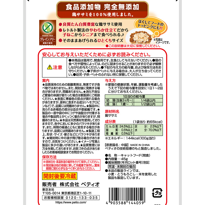 ・良質たん白質豊富な鶏ササミをレトルト製法でやわらかく仕上げました。・やわらかいので子ねこからシニアまで安心して与えられます。・ひとくちサイズだからそのままでも、ほぐしてフードのトッピングにも!・グレインフリーでねこちゃんの健康サポート・食物アレルギーに配慮。・食品添加物 完全無添加。
