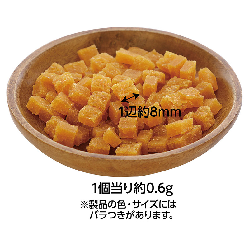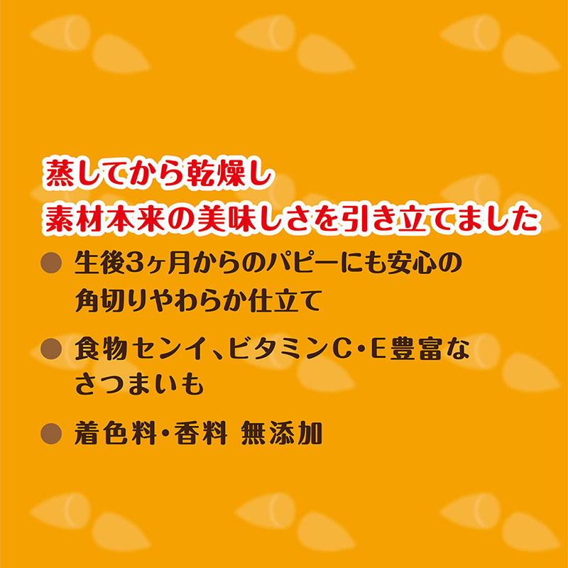 ・蒸してから乾燥し、素材本来の美味しさを引き立てました。・食物センイ、ビタミンC・E豊富なさつまいもを100%使用。・やわらか仕立てなので、生後3ヶ月からのパピーにも安心して与えられます。・着色料・香料 無添加。