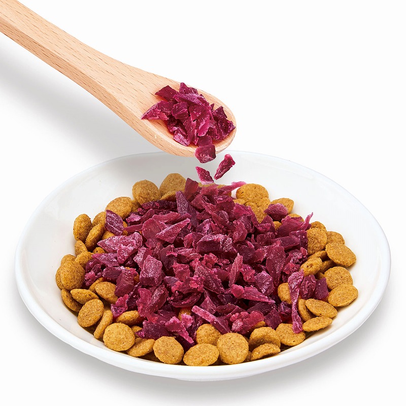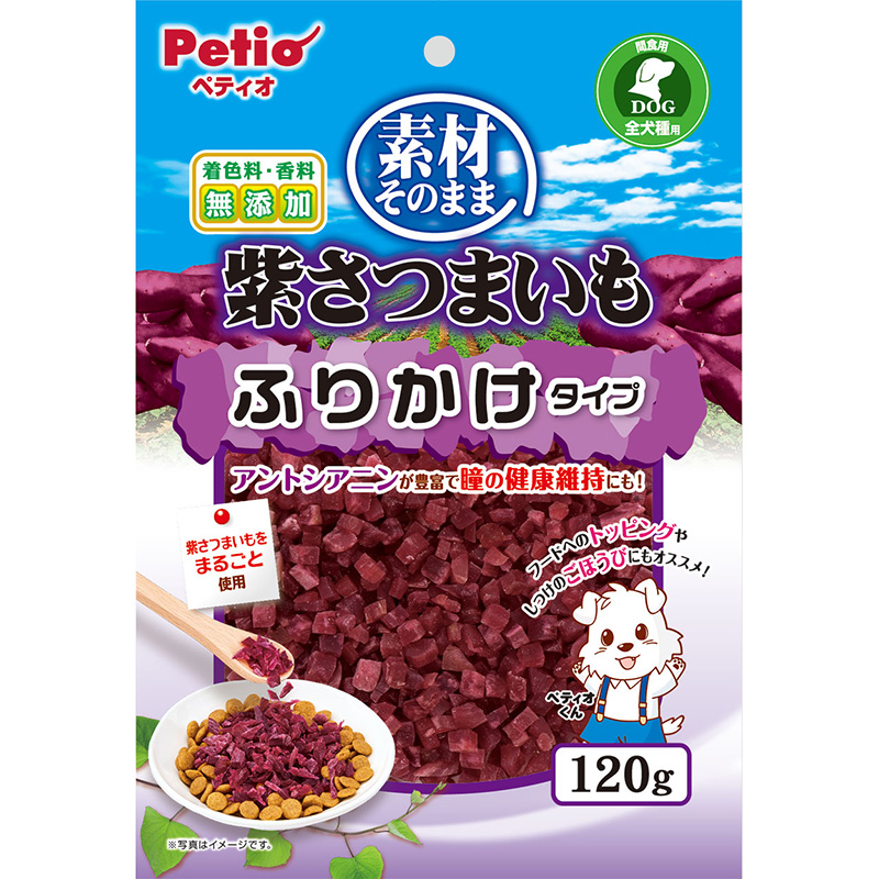 ・素材そのまま。自然の甘みが美味しい紫サツマイモのおやつです。・蒸してから乾燥しているので糖度がUPし甘みが濃縮されています。・紫サツマイモには、お腹の健康にいい食物繊維と、瞳の健康にいいアントシアニンが豊富に含まれています。・フードのトッピングに便利なふりかけタイプ・しつけのごほうびにも。・着色料・香料は使用しておりません。