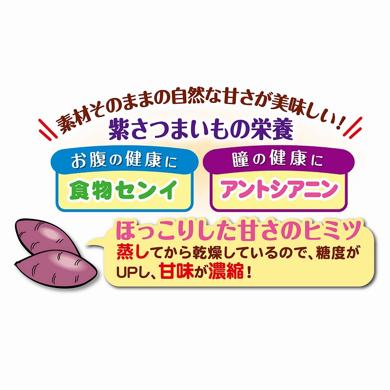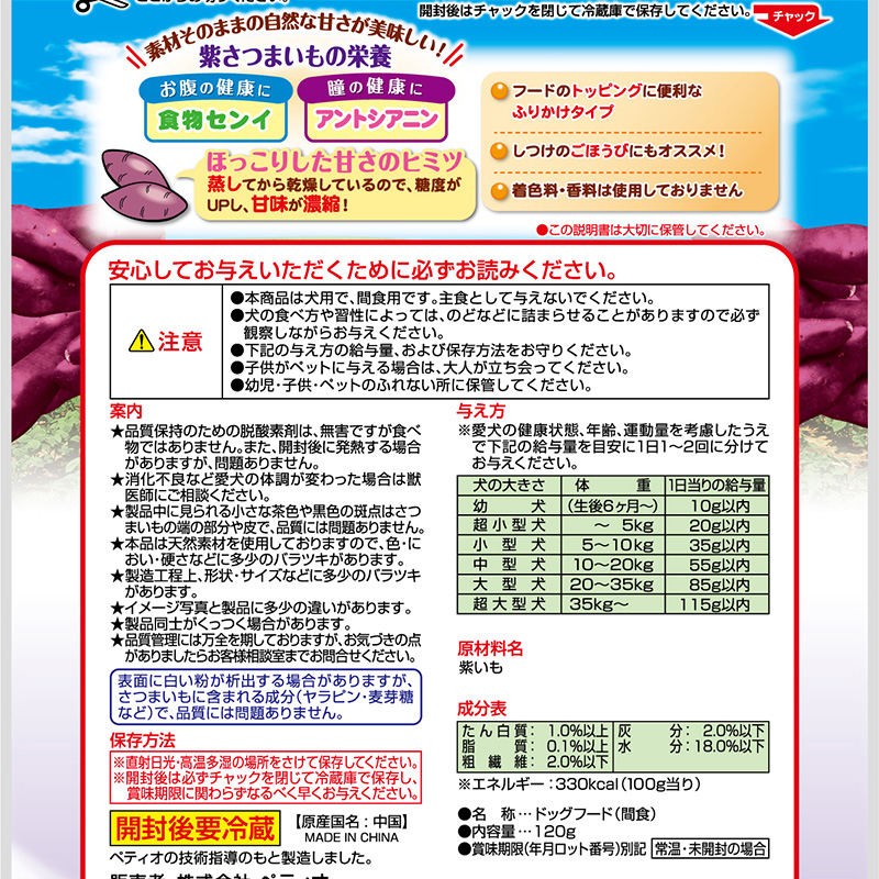 【原材料】紫いも【保証成分】たん白質1.0%以上、脂質0.1%以上、粗繊維2.0%以下、灰分2.0%以下、水分18.0%以下【エネルギー】330kcal/100g