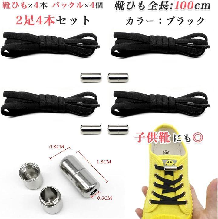 「商品内容」セット内容:2足分(靴ひも:4本入 金属カプセル:4個入) 靴ひもの全長:100cm カプセルバックルサイズ:長さ1.8cm、幅0.8cm、穴径0.3cm 重量:約15g 材質:ゴム製 カラー:ブラック