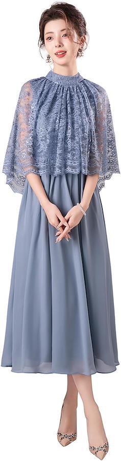 「華やかなパーティドレス」優美なレースが織り成すケープと、フワッとエレガントに広がるスカートの異素材MIXがパーティで目を引く華やかなドレスです。
