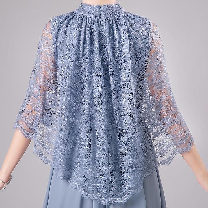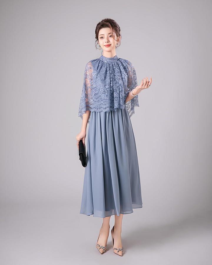 「異素材MIXの華やかなパーティドレス」 このドレスは、優美なレースが織り成すケープ状のトップスと、フワッとエレガントに広がるスカートが特徴の2ピース風ワンピースです。
