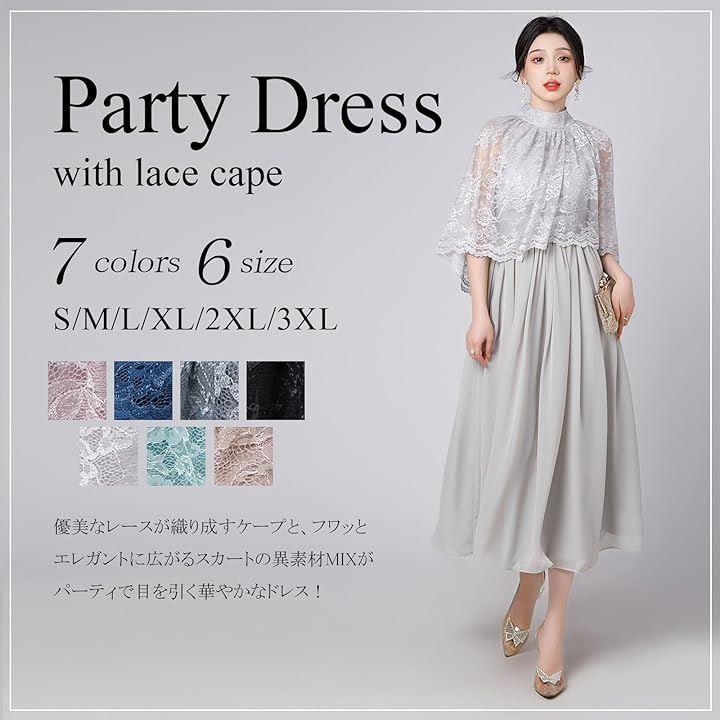 「異素材MIXの華やかなパーティドレス」 このドレスは、優美なレースが織り成すケープ状のトップスと、フワッとエレガントに広がるスカートが特徴の2ピース風ワンピースです。