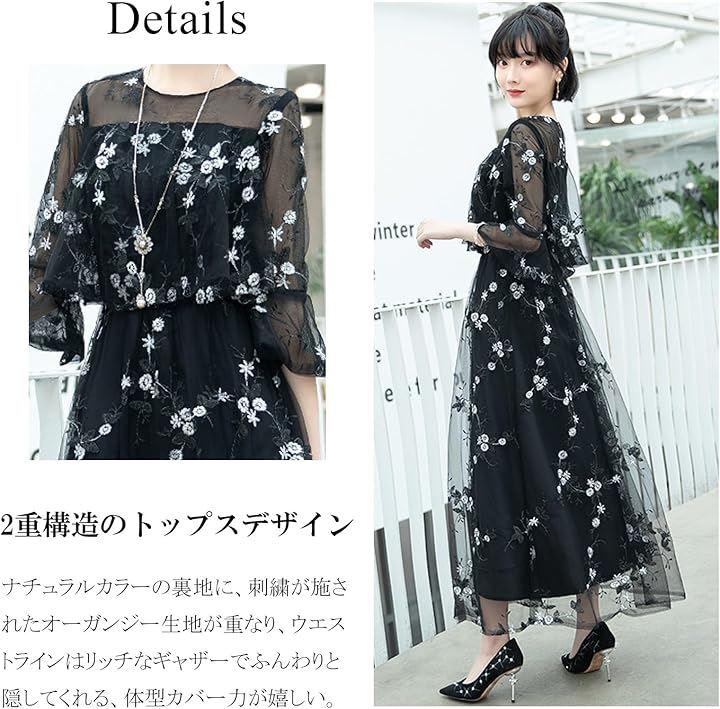 「考え抜かれたデザイン」上品でエレガントなロング、マキシ丈スカートは高いウエストラインにより足長効果が高く、全体的に2枚構造になった刺繍入りのシースルー素材とのレイヤードが、他にはないデザインで目を引きます。胸元のラインと袖には裏地がなくスッキリと細見えの効果もあり。