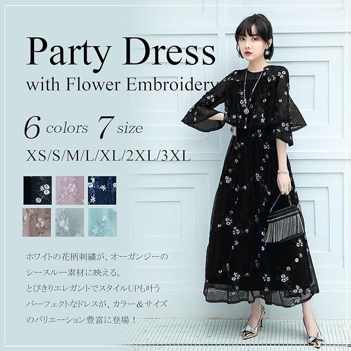 結婚式のパーティー、納会、謝恩会、発表会、同窓会など・・突然のご招待の席にも最適な、オールシーズン使えて嬉しいパーティドレス。遠目で見てもわかる全体にちりばめられた花柄の刺繍とオーガンジー素材がエレガントな印象で、胸元のシースルー、手元を華やかに見せるベルスリーブなど、とびきり女性らしいディテールが満載。パーティの席でであなたを目立たせる一着になる事間違いなしです。