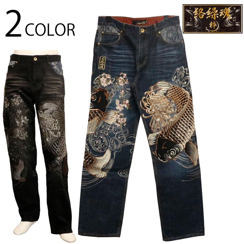 (復刻) 双鯉 柄 刺繍 和柄 デニムパンツ