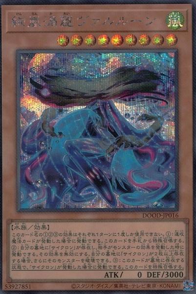 ■搭載パック:[DOOD]DOOMOFDIMENSIONS■収録:基本パック■■レアリティ:シークレットレア■種類:効果モンスター■属性:風■種族:水族■星(レベル、ランク):9■攻撃力:0■守備力:3000■リンク:‐■リンク方向:‐■ペンデュラムレフト:‐■ペンデュラムライト:‐■■シリーズ:第13期■効果テキスト:このカード名の①②③の効果はそれぞれ1ターンに1度しか使用できない。①:速攻魔法カードが発動した場合に発動できる。このカードを手札から特殊召喚する。②:自分の墓地に「サイクロン」が存在し、相手がモンスターの効果を発動した時に発動できる。その効果を無効にする。自分の墓地に「サイクロン」が2枚以上存在する場合、さらにそのモンスターを破壊できる。③:このカードが墓地に存在する状態で「サイクロン」が発動した場合に発動できる。このカードを特殊召喚する。■ペンデュラムテキスト:‐
