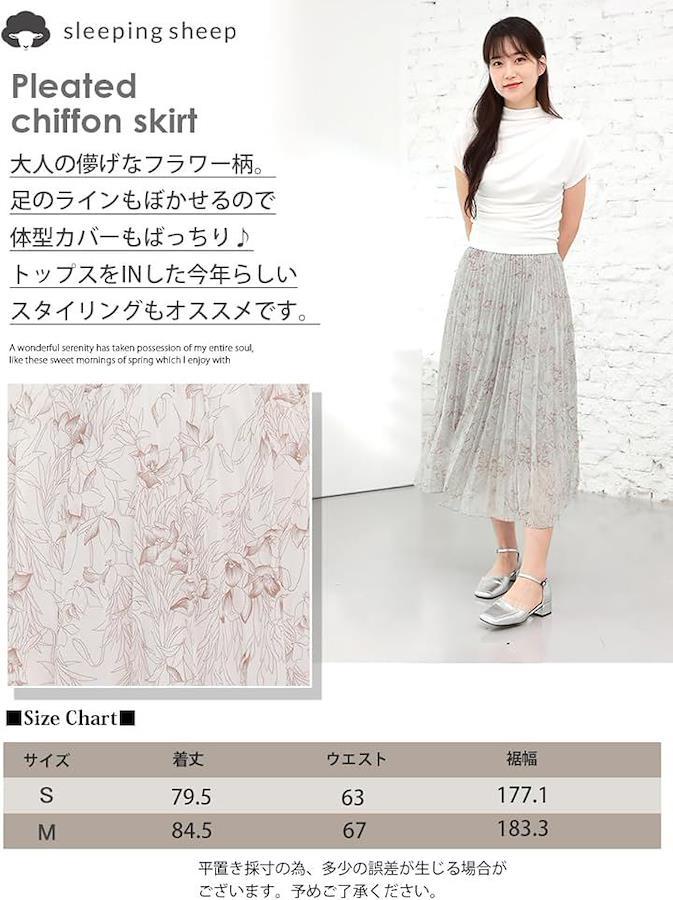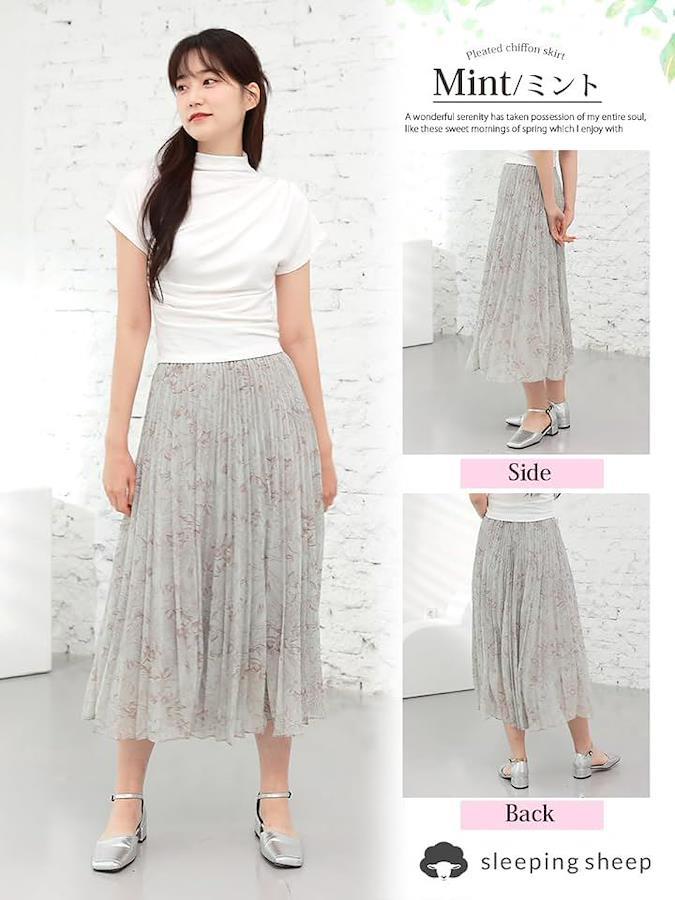 線画タッチ ムード フラワー プリント シフォン プリーツ フレア スカート