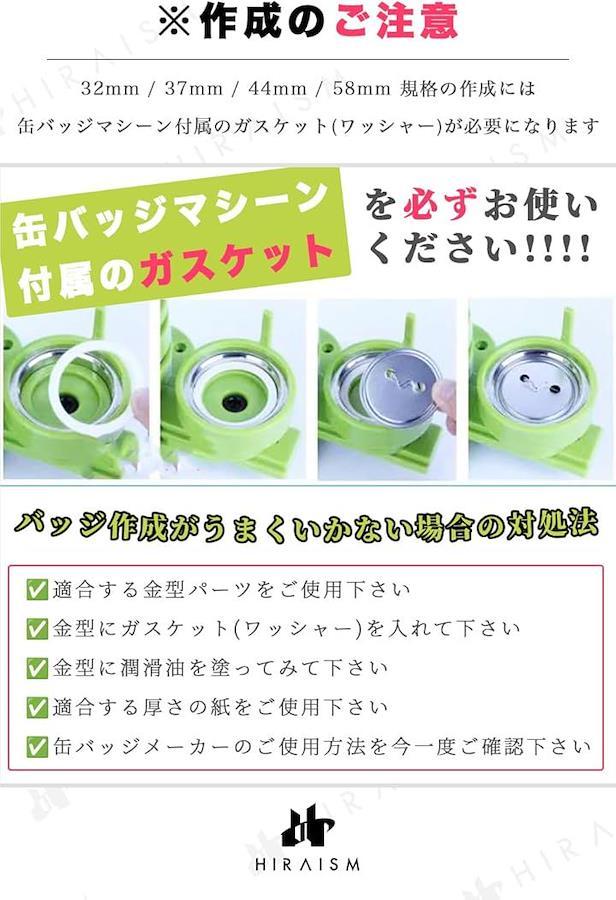 *ご注意 32mm / 37mm / 44mm / 58mm規格の作成には、缶バッジマシーン付属のガスケット(ワッシャー)が必要になります。