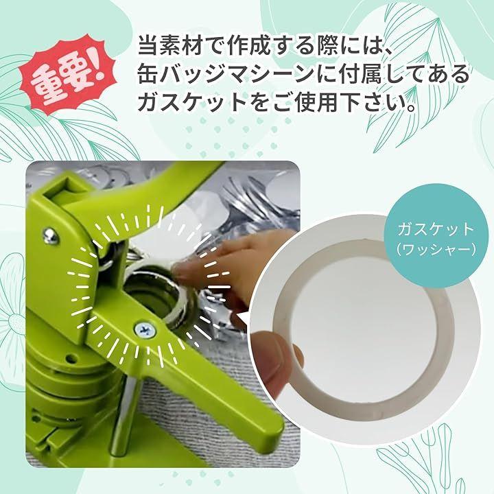 カンタン安全に使える缶バッジ製作セット。「セット内容」: 缶バッジシェルx100 ピンバックx100 バッジフィルムx100 「入り数」:各100個セット/各200個セット/各300個セット 「サイズ」: 直径25mm / 32mm / 37mm / 44mm / 50mm / 56mm / 58mm / 75mm *32mm / 37mm / 44mm / 58mm / 75mm規格にて、当素材(鉄製)で缶バッジを作成する際には、缶バッジマシーンに付属してあるガスケット(ワッシャー)を金型に入れてご使用下さい。