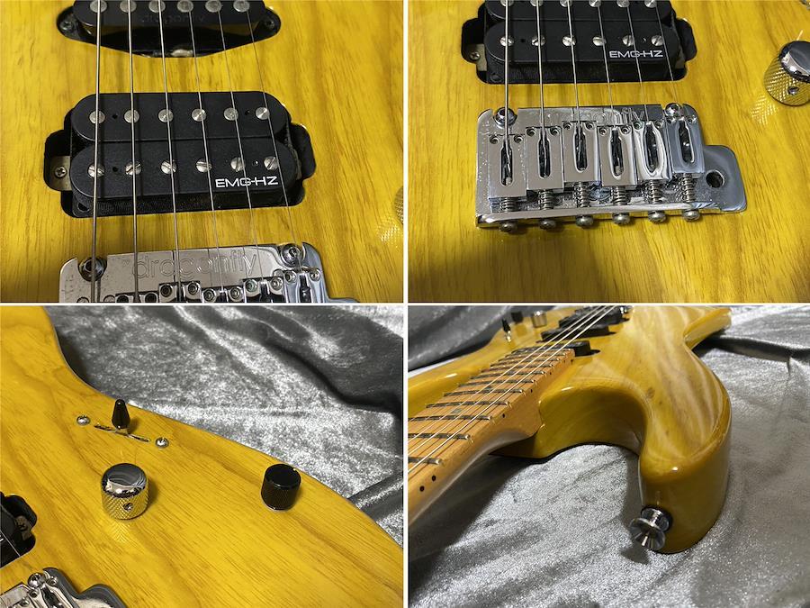 ピックアップはHSSレイアウトで、コントロールはマスターボリューム、ハイ・ローパスフィルターというシンプルな仕様となっております。フロント・センターはdragonflyオリジナルシングルコイル、リアはEMG-Hzハムバッカーに換装されています。