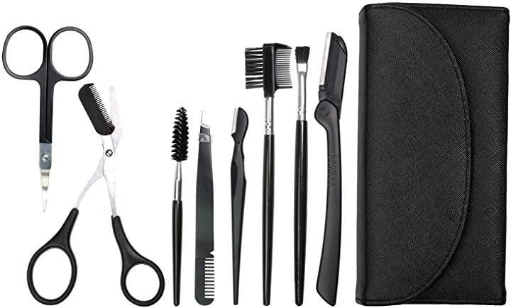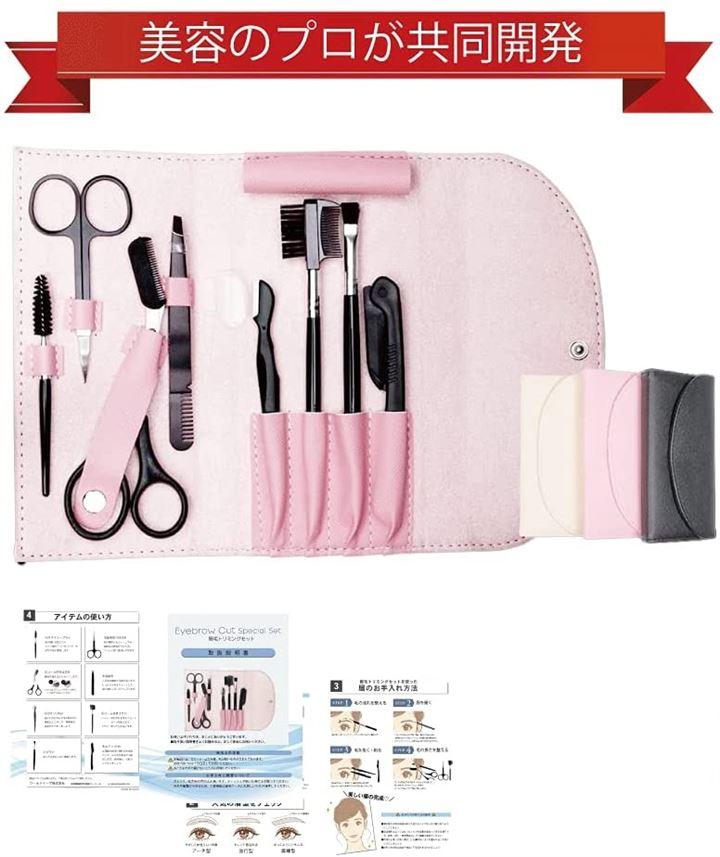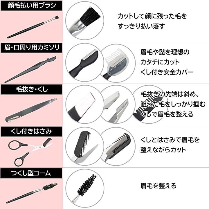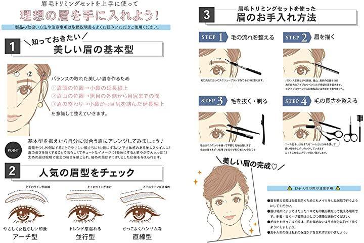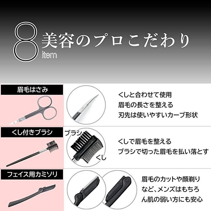 ・「セット内容」 ・つくし型コーム ・眉毛はさみ ・クシ付きはさみ ・毛抜き ・クシ付きコーム ・眉周り口周り用カミソリ ・顔毛払い用筆 ・フェイス用カミソリ ・カラーが選べる。専用ケース(3色あり) ・理想の眉が見つかるガイド付き(日本語説明書)