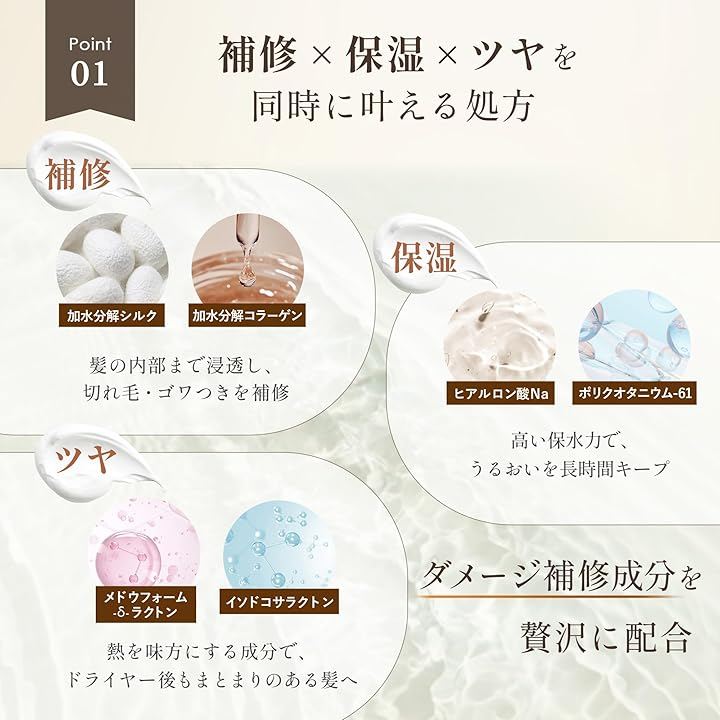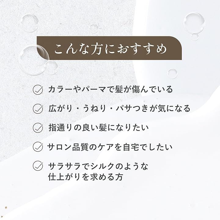 本製品は、アルガンオイル・シルク・コラーゲン・ヒアルロン酸などの成分を贅沢に配合した、サロン発想のヘアトリートメントです。