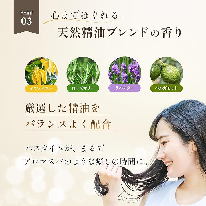 イランイラン、ベルガモット、ラベンダーなどの天然精油ブレンドが、バスルームを包み込むように香り、毎日のヘアケアを“癒しの時間”へ。