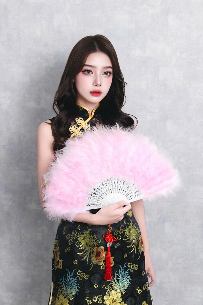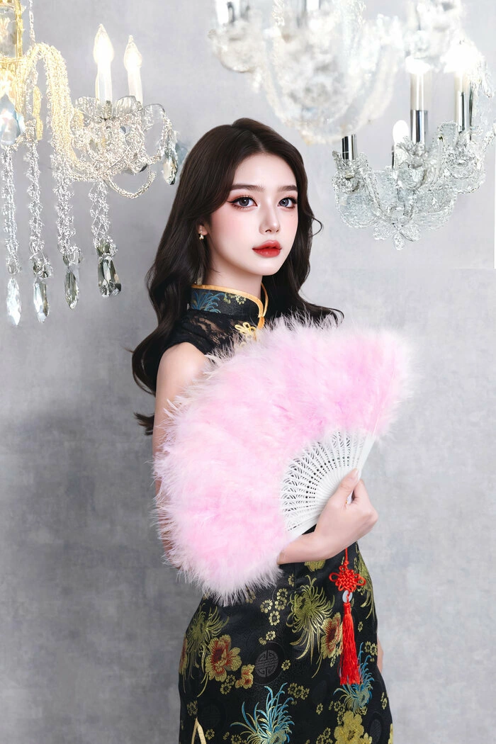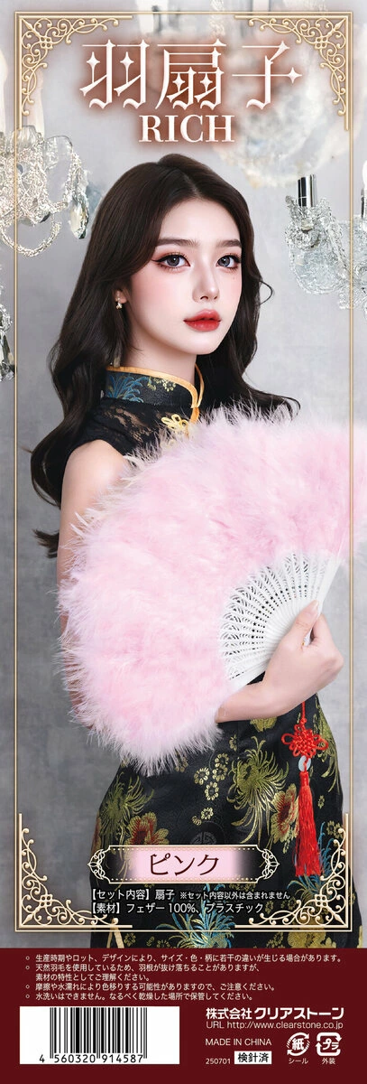 ふわふわでボリューム感のあるフェザーを両面にあしらった、ゴージャスな扇子。