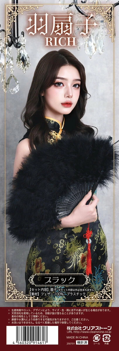 ふわふわでボリューム感のあるフェザーを両面にあしらった、ゴージャスな扇子。