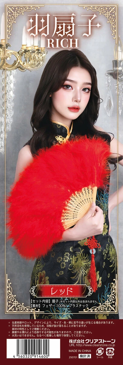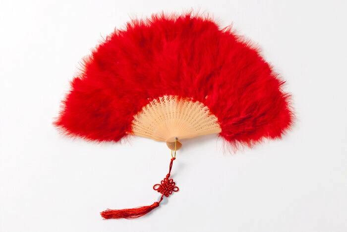 ふわふわでボリューム感のあるフェザーを両面にあしらった、ゴージャスな扇子。