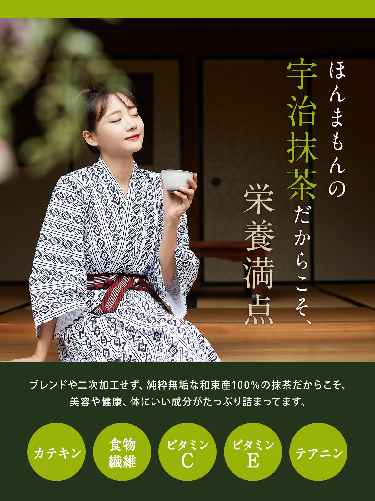 【日本最高級の品質】日本一の品質の良さで有名な宇治抹茶の中でも、最も品質が良いとされる和束産を100%使用。他産地の茶葉は一切含まれておりません。?【日本一の抹茶生産】京都産の茶葉の約40%は和束産で、抹茶の原料である碾茶の生産量は、国内生産量の22%を占め、日本一です。?【菓子職人との共同開発】全国の菓子職人の要望、お声に応えて、共同開発した宇治抹茶パウダーです。鮮やかな緑色、香りを強く、渋みが少なく、甘味が強い、職人のための宇治抹茶パウダーとして開発しました。非常に多くのリピートをいただいております。?【一切無添加】クロレラ、着色料は一切使っておりません!クロレラ配合の抹茶は含有量をよく調べる必要があります。クロレラ特有の香りが抹茶の香りよりもかなり強いです。?【栄養が満点】ブレンドや二次加工せず純粋無垢な宇治抹茶、和束産100%だからこそ、カテキン、食物繊維、ビタミンC、ビタミンE、テアニン、栄養素が豊富な食品です。?【容量】100gの抹茶パウダーです。スイーツやラテ様にも幅広くお使いできます。【免責事項】メーカーによる商品リニューアルに伴いパッケージ(内容量も含む)変更が行われた場合、新パッケージでお届け致します事ご了承願います。