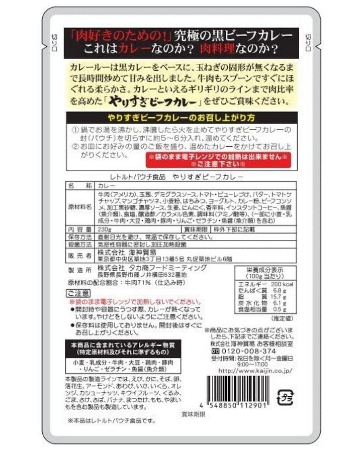 3営業日以内に発送≪新品未開封品≫カレーのルーと肉がほぼ半々のお肉ガッツリカレー!肉比率43%のやりすぎビーフカレー 230g×5パック(牛肉100g/1パック) | ビーフカレー レトルト カレー レトルトカレー 黒カレー ビーフシチュー デミグラスソース たまねぎ トマト 簡易包装 長期保存 保存食 常温保存 名称やりすぎビーフカレー 内容量5パック(1パックあたり230g) 牛肉100g、ルー130g 原材料牛肉、玉ねぎ、デミグラスソース、トマトピューレー漬け、バター、トマトケチャップ、マンゴチャツネ、小麦粉、はちみつ、ヨーグルト、カレー粉、ビーフコンソメ、加工黒砂糖、濃厚ソース、しょうが、にんにく、香辛料、インスタントコーヒー、魚醤(魚介類)、食塩、醸造酢/カラメル色素、調味料(アミノ酸等) ※アレルギー成分:一部に小麦粉、乳成分、牛肉、大豆、鶏肉、豚肉、りんご、ゼラチン、魚醤を含む 産地牛肉:アメリカ産【重要】メーカーによる商品リニューアルに伴いパッケージ(内容量も含む)変更が行われた場合、新パッケージでお届け致します事ご了承願います。