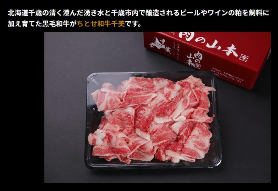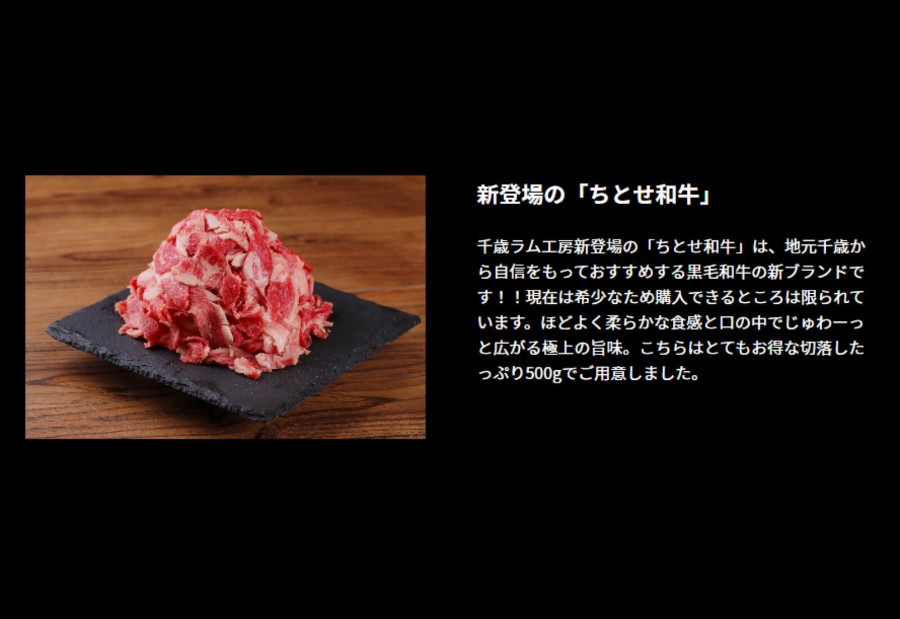 本品は、地元千歳の新ブランド「ちとせ和牛千美(ちとせわぎゅうせんび)」の切り落とし肉500gです。