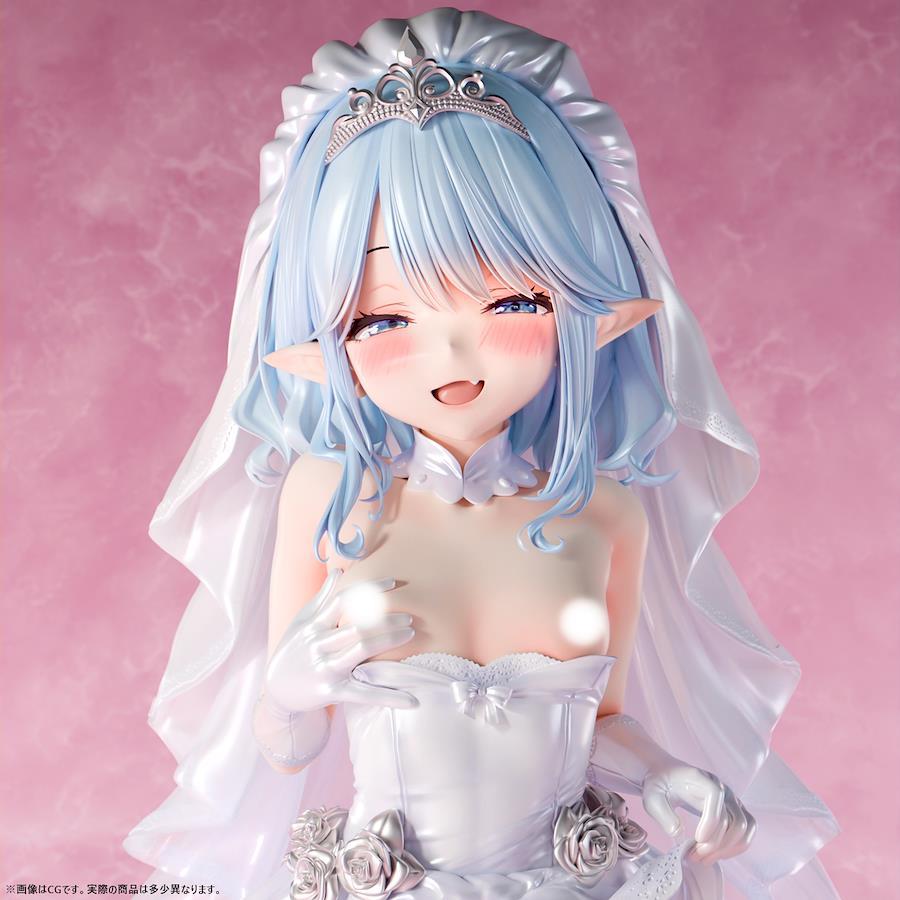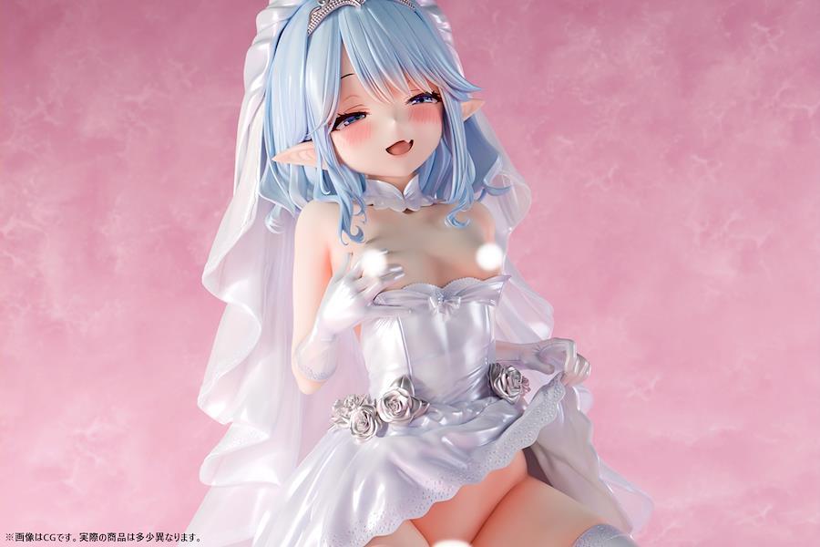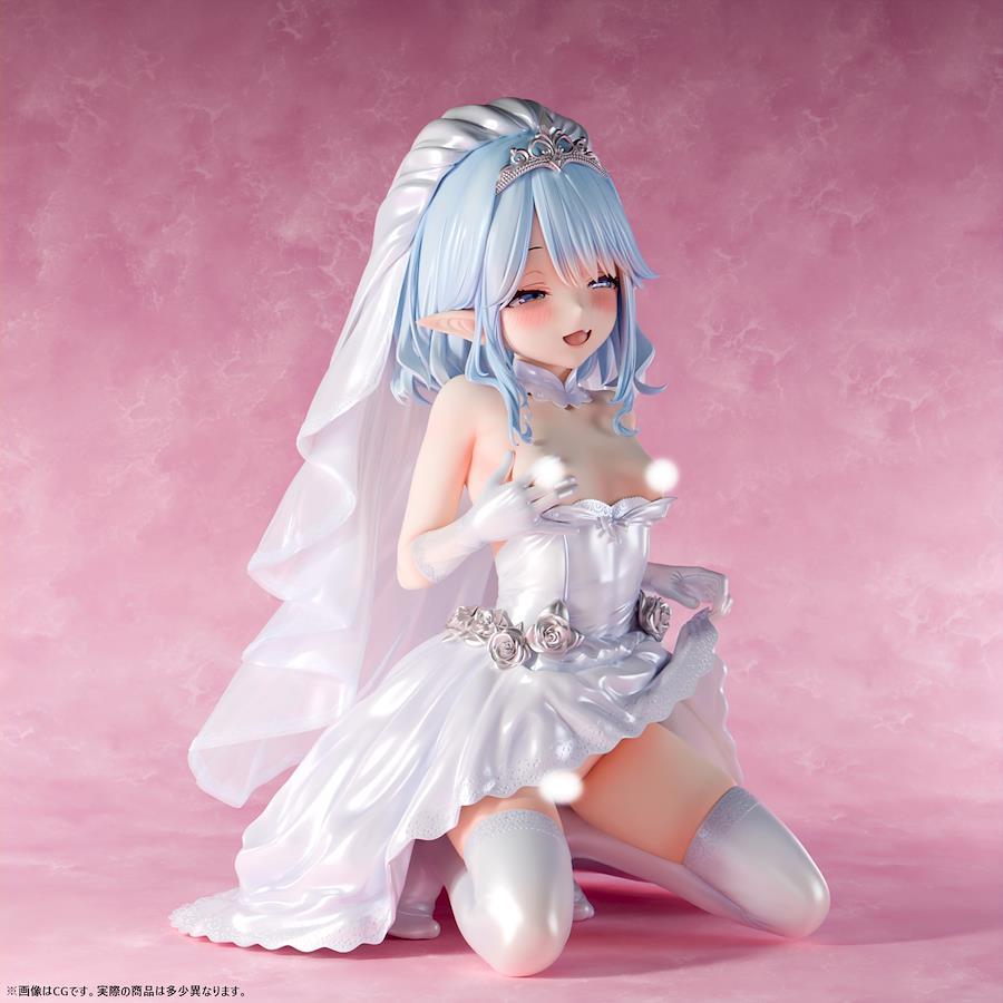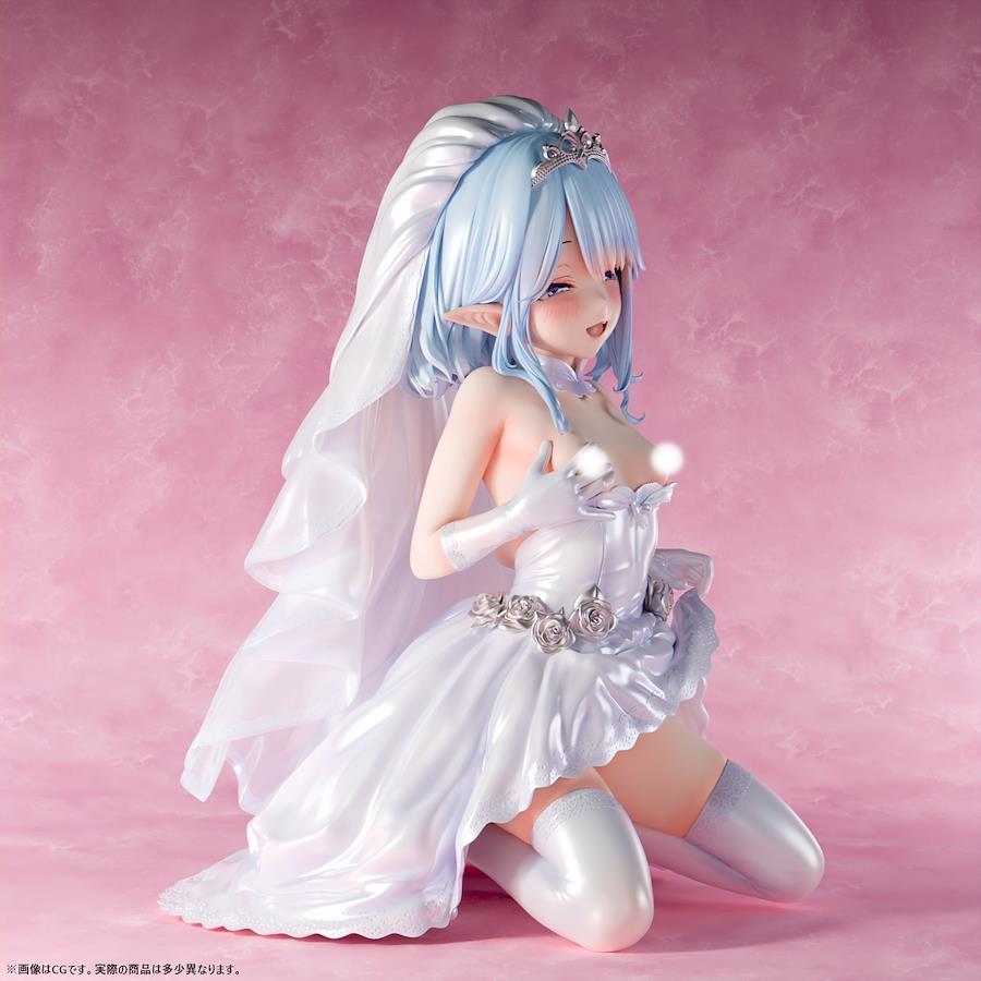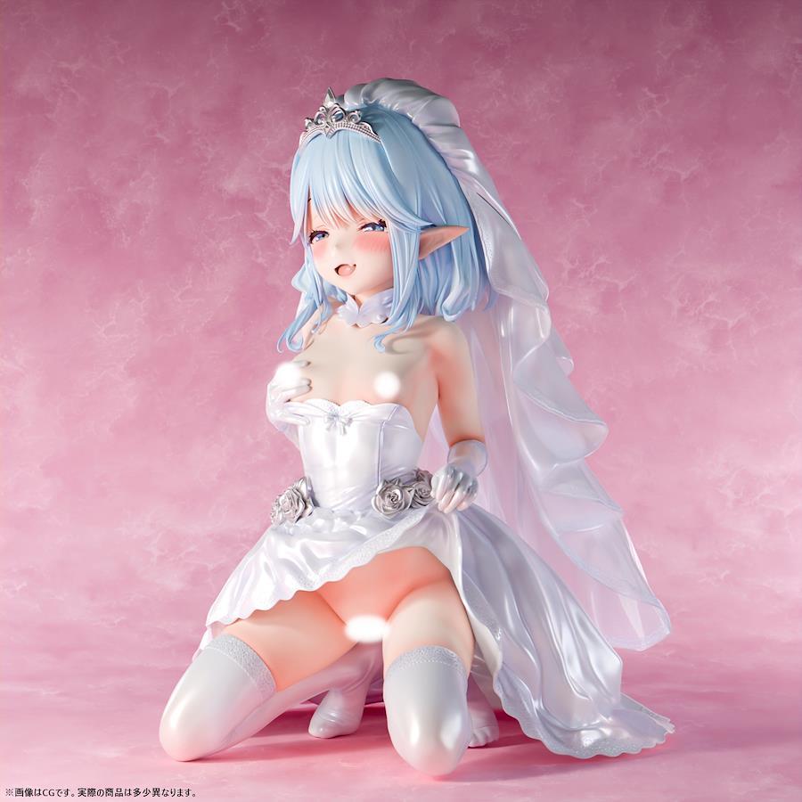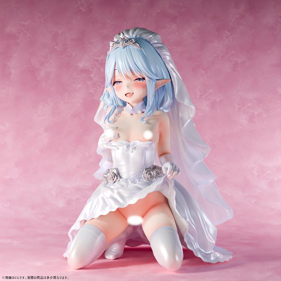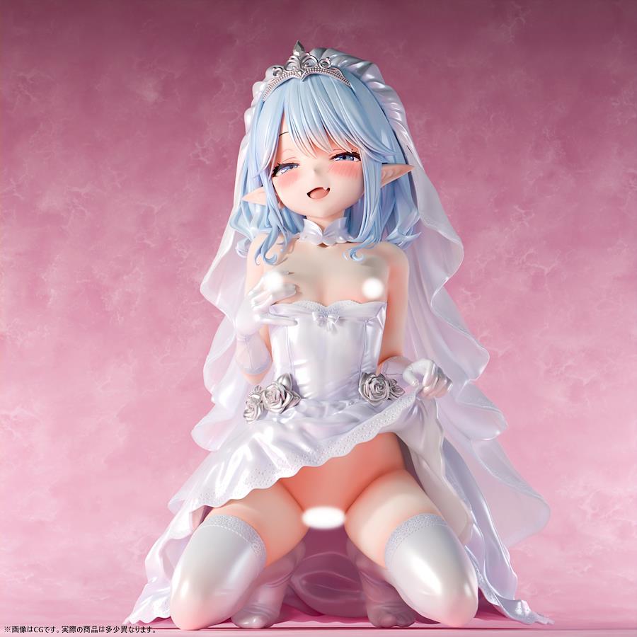 肉感少女シリーズより、美しく愛らしいエルフの花嫁「エイルリス」が1/5スケールフィギュアで新登場!つるぺたな胸や、ほっそりとした柔らかな太ももなど、可憐さにこだわって造形されたボディラインをお楽しみいただけます。ウェディングドレスにはリボンや花飾りをあしらい、花嫁らしい華やかさを演出。さらに、ベールの繊細な透け感が少女の魅力をいっそう引き立てます。可憐な花嫁「エイルリス」を、ぜひあなたのお部屋にお迎えください。