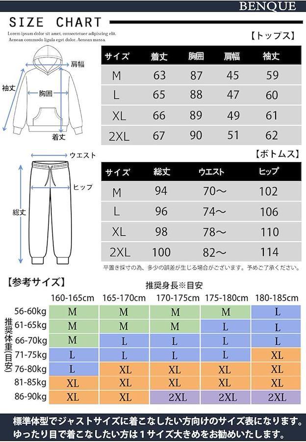 *素材:ポリエステル100% *カラー:ブラック、グレー *サイズ:M,L,XL,2XL,3XL トップス 着丈 /胸囲 /肩幅 /袖丈 [M] : 63 / 87 / 45 / 59 [L] : 65 / 88 / 47 / 60 [XL] :66 / 89 / 49 / 61 [2XL] :67 / 90 / 51 / 62 ボトムス 総丈 /ウエスト(ゴム仕様) /ヒップ [M] : 94 / 70~ / 102 [L] : 96 / 74~ / 106 [XL] :98 / 78~ / 110 [2XL] :100 / 82~ / 114