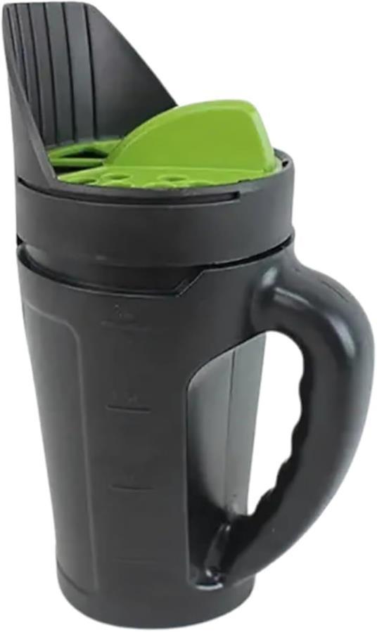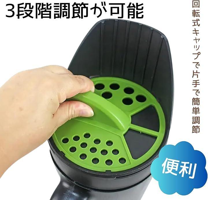 散布時は回転キャップで排出口を開閉し、片手で本体を持って歩きながら撒くだけ。
