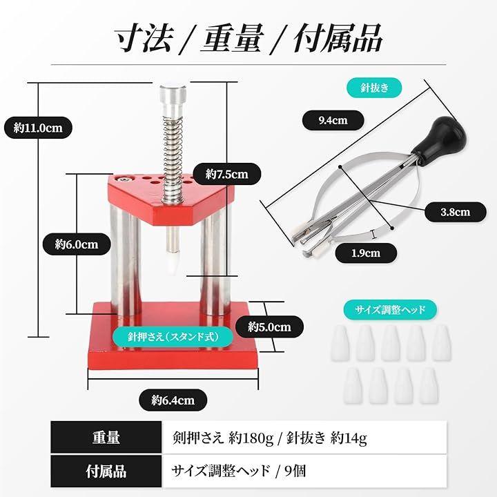 垂直方向に力をかけられるスタンド式の針押さえと、ピンセット型で針を簡単に引き抜きできる針抜きのセットになります。