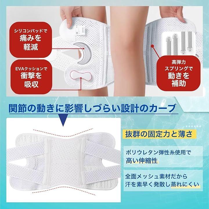 「特殊スプリング内蔵でしっかり支える高機能設計」この膝サポーターには、左右に2本ずつの特殊スプリングを内蔵し、膝関節の自然な動きをしっかりとサポート。