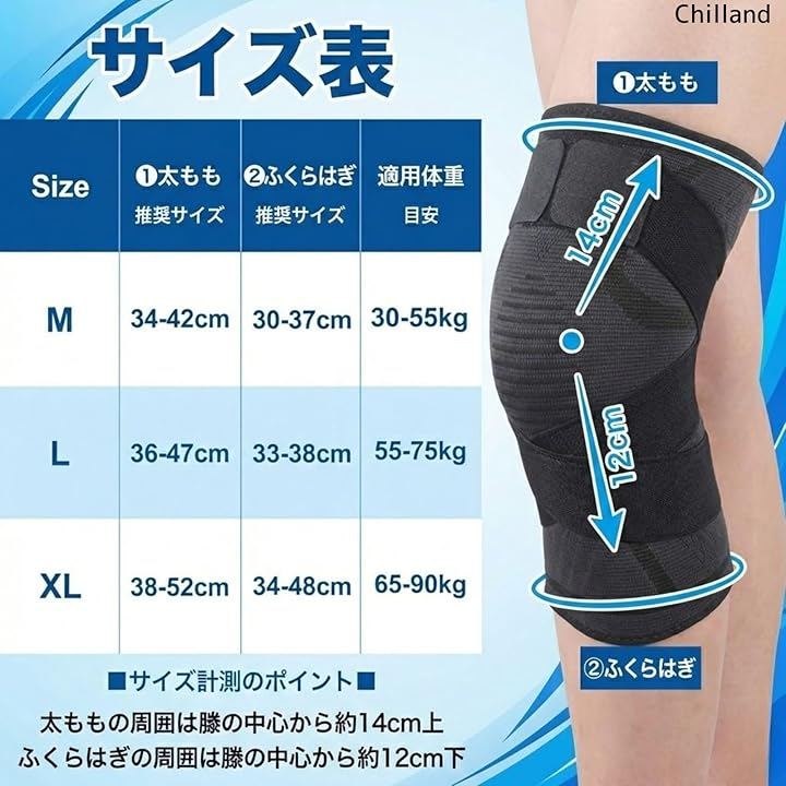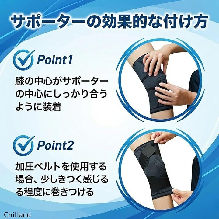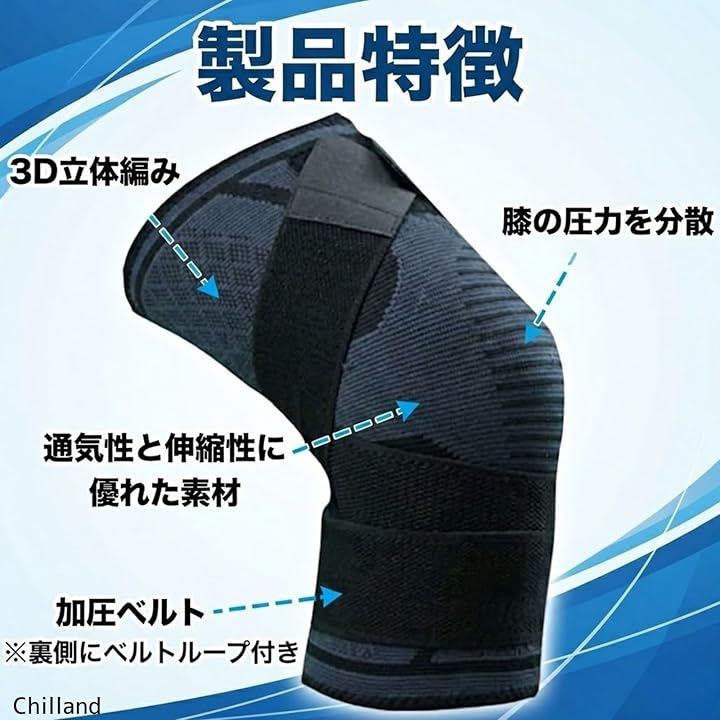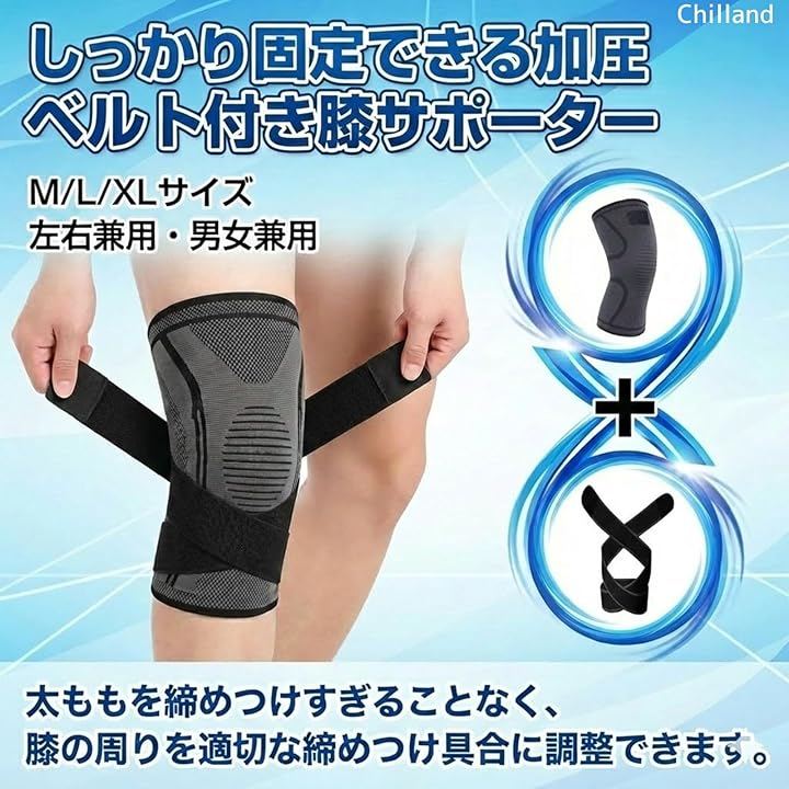 膝を固定できる加圧ベルト付き:調整可能な加圧ベルトで膝周りをしっかり固定します。